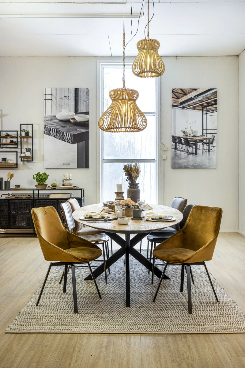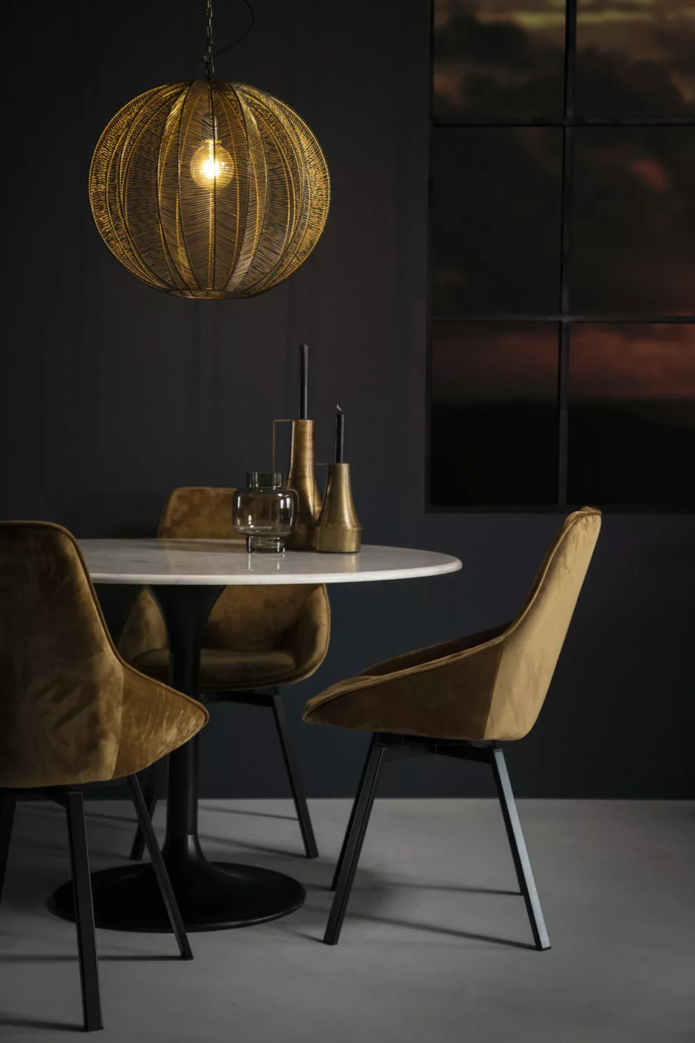Okran keltainen pyörivä ruokapöydän tuoli samettisella sametti-istuimella. Pehmoinen ylellinen sametti yhdistettynä trendikkääseen mustaan pyörivään metallirunkoon takaa loistavan isuinmukavuuden ja ylelllisen ruokailuryhmän. Tyylikäs konjakin sävyinen keltainen väri tuo energiaa sisustukseen tai toimistoon. Kerää ruokapöydän ympärille tai pehmennä toimiston tunnelmaa, yhdistele eri värejä tai muita BY-BOOn tuolimalleja. Saatavilla myös muita värejä.