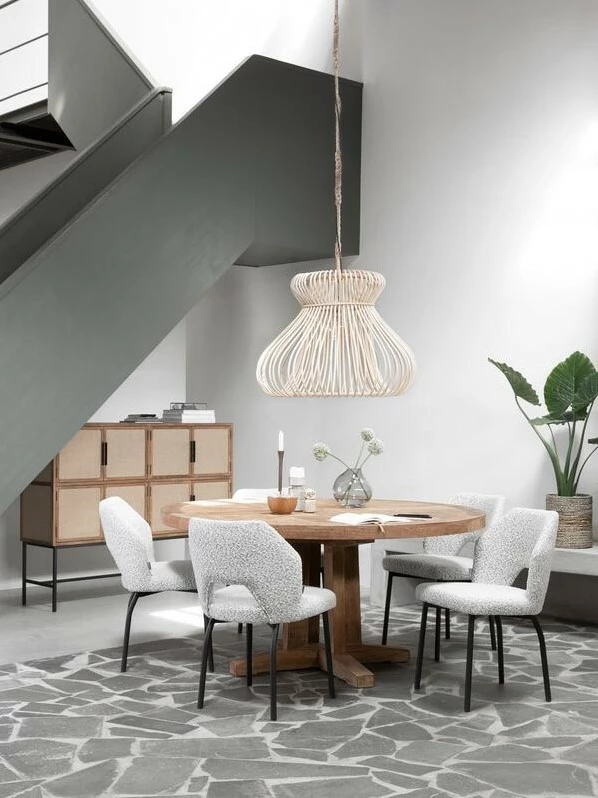 Upea Bloom ruokapöydän tuoli kutsuu istumaan pidempääkin iltaa. Tuolissa on metallinen tukeva runko ja jalat sekä miellyttäväksi pehmustettu bouclé kankainen istuinosa. Istuimen jämäkkä mutta pehmeä selkänoja on muotoiltu hieman kuppimaiseksi, mikä tekee tuolista istuinmukavuudeltaan huippuhyvän.