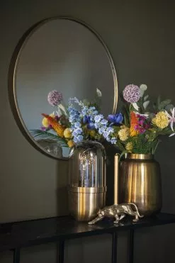 Upean näyttävä kultainen iso vaasi juhlakauteen tai kun haluat luksusta vähän rouheammassa muodossa. Tunnelmallinen kulutetun näköinen metallipinta. Messinkinen vaasi on näyttävä ihan sellaisenaan, mutta voit myös yhdistää sen saman sarjan korkeampaan vaasiin tai käyttää sitä vaikka kauniille oksalle, kukille tai kuivakukille.