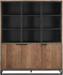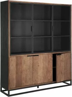 Tyylikäs suuri tiikkipuinen vitriinikaappi mustilla metallijaloilla ja mustiksi käsitellyillä yksityiskohdilla. Kolme isoa kaappia säilytykseen ja tummennetujen lasien takana avohyllyt tyylikkääseen säilytykseen. Tämä vitriinikaappi toimii niin astiakaappina kuin kauniina säilytyskalusteena muissa tiloissa. Rouheasti viimeistelty tiikkipinta tuo kotoisuutta ja lämpöä sisustukseen. Kaunis ja helppohoitoinen tiikkipuu on kestävä ja ikuinen materiaali.