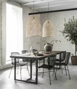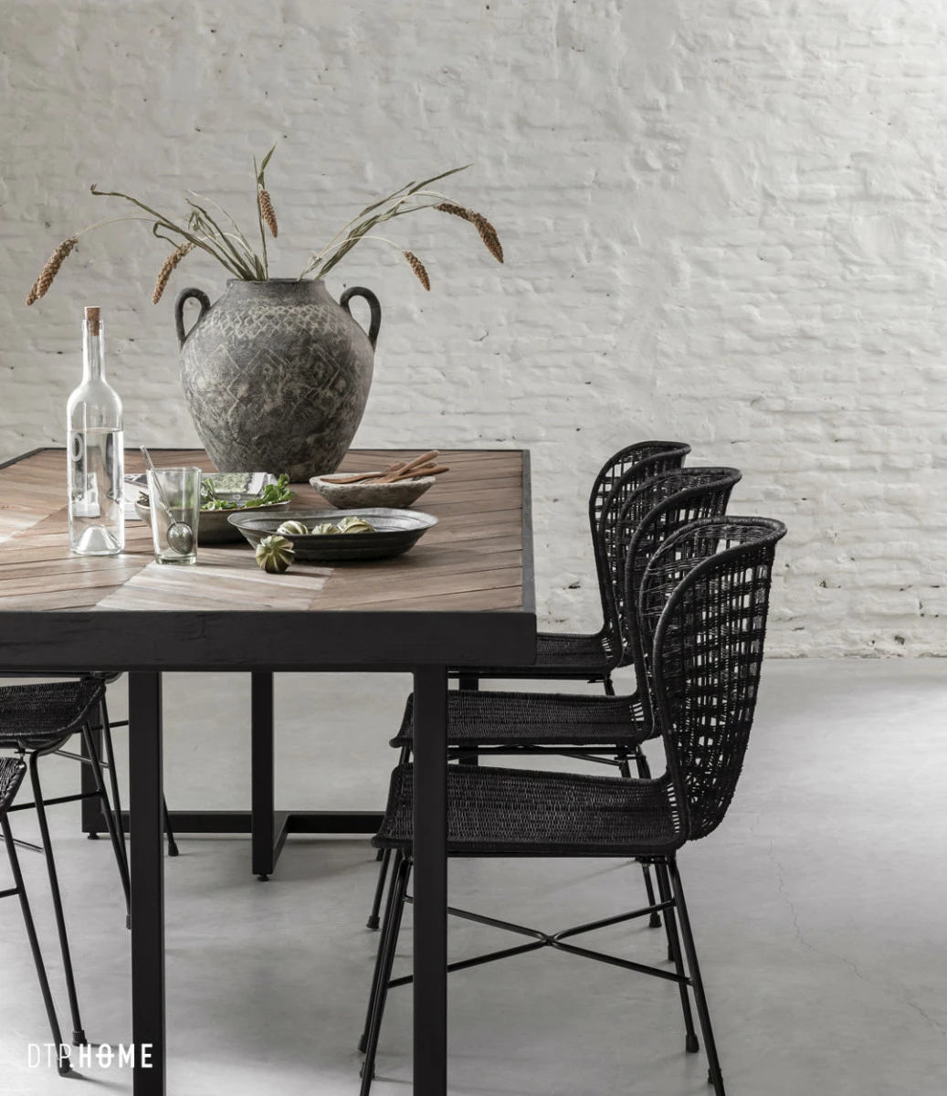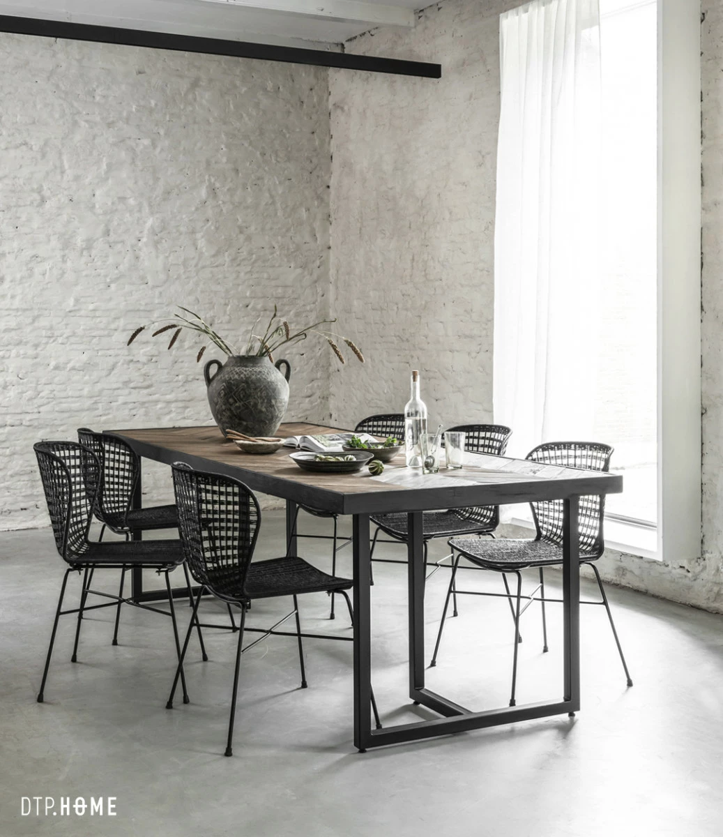Katsetta ja elämää kestävään sisustustyyliin Criss Cross kalanruotokuvioinen ruokapöytä. Tyylikäs mielenkiintoinen muotoilu, jossa näyttävät mattamustat rautajalat ja mustaksi käsitelty tiikkipuukehys muodostavat upean raamin kauniille kalanruotopöydälle. Tämä suurin koko käy noin 8-10 ruokailijalle. Kierrätystiikki on materiaalina kestävä niin arjessa ja juhlassa. Kaunista, kestävää ja luontoa kunnioittavaa.