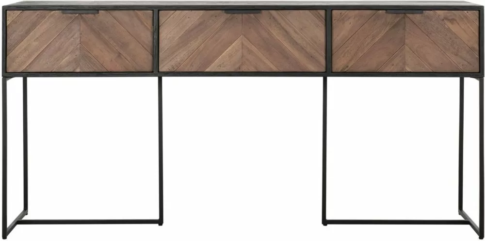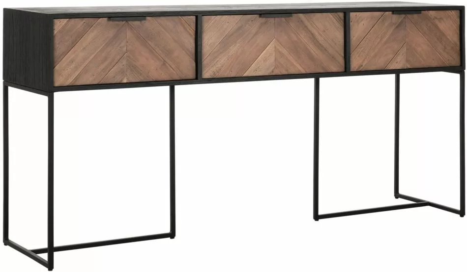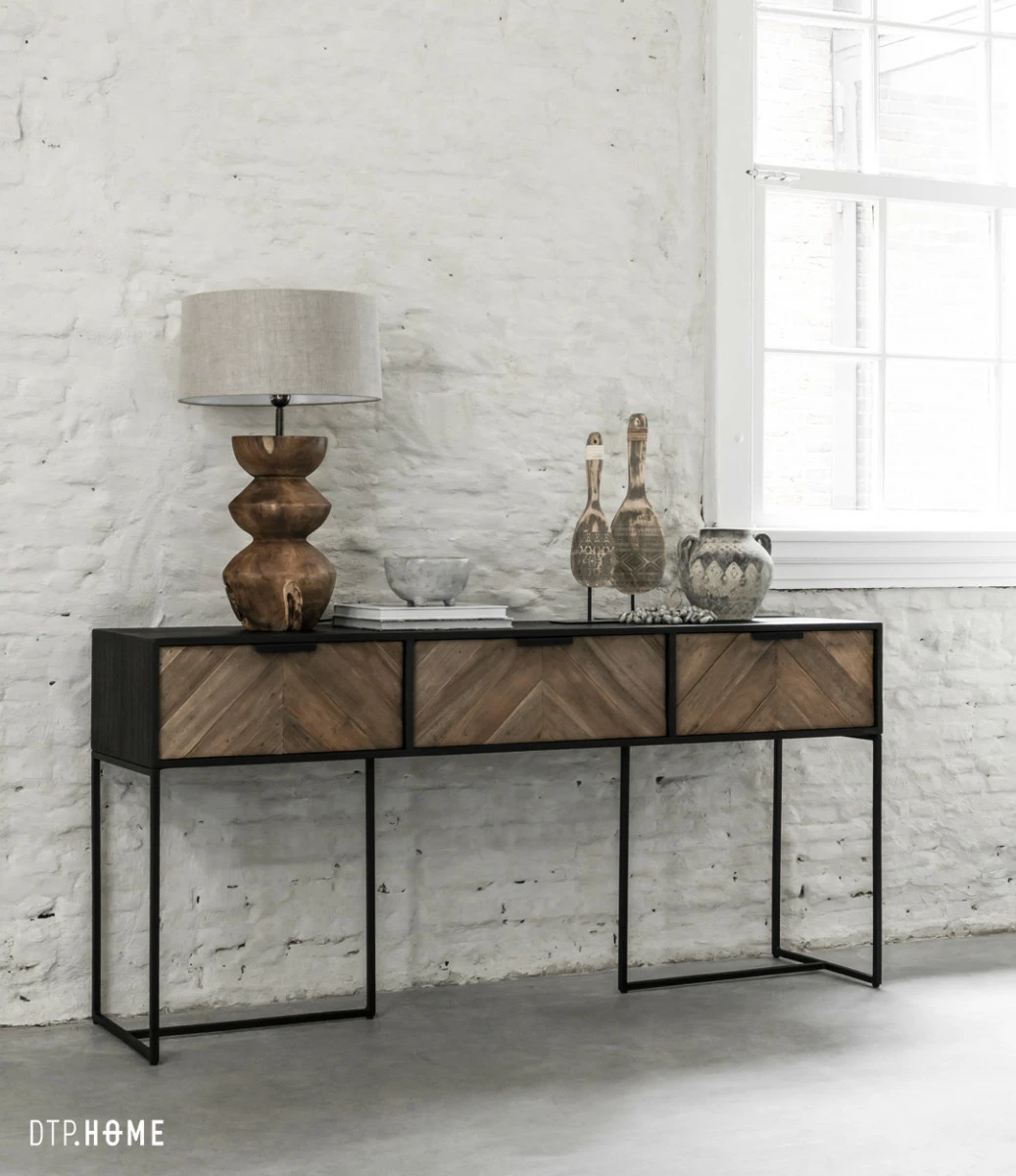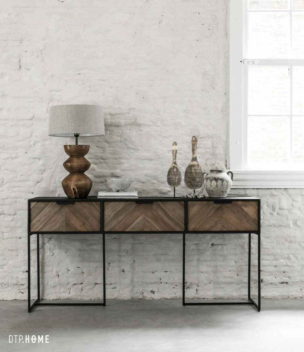 Katsetta ja elämää kestävään sisustustyyliin upea tiikkipuinen konsolipöytä. Kalanruotokuvioinen kierrätystiikistä tehty pöytätaso ja rautarunko kestää vaikka haluaisit sisustaa suuren ruukun tai vaasin sivupöydälle. Puiset alalaatikot tuovat lisäsäilytystilaa. Toimii mainiosti eteisen laskutilana ja kauniina sisustuselementtinä sekä myös olohuoneen sisustukseen. Snuggin konsolipöydät tehdään kierrätystiikistä ja raudasta. Kaunista, kestävää ja ekologista.