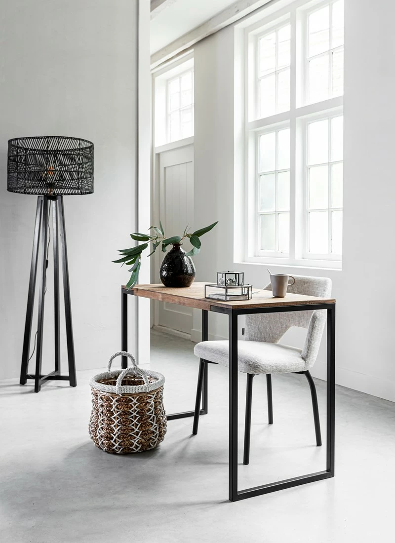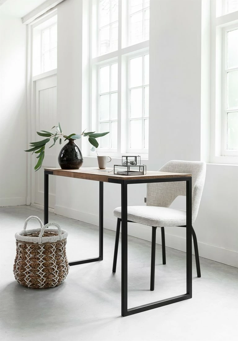 Tyylikäs tiikkipuinen työpöytä tekee työpisteestä salonkikelpoisen. Tämä pieni puinen kirjoituspöytä mahtuu mukavasti pienen tilan työpöytäksi kun leveys on vain 100cm. Elemental-sarjan muotoilu on kulmikasta, mutta rouheasti viimeistelty tiikkipinta tuo kotoisuutta ja lämpöä tyyliin. Rouhean lankkupöydän viimeistelee rautajalka, joka nousee pöytälevyn alle korostamaan pöydän mallia. Mielenkiintoisena yksityiskohtana ovat myös vaakaan ladotut laudat, mikä antaa pöydälle modernia ilmettä.