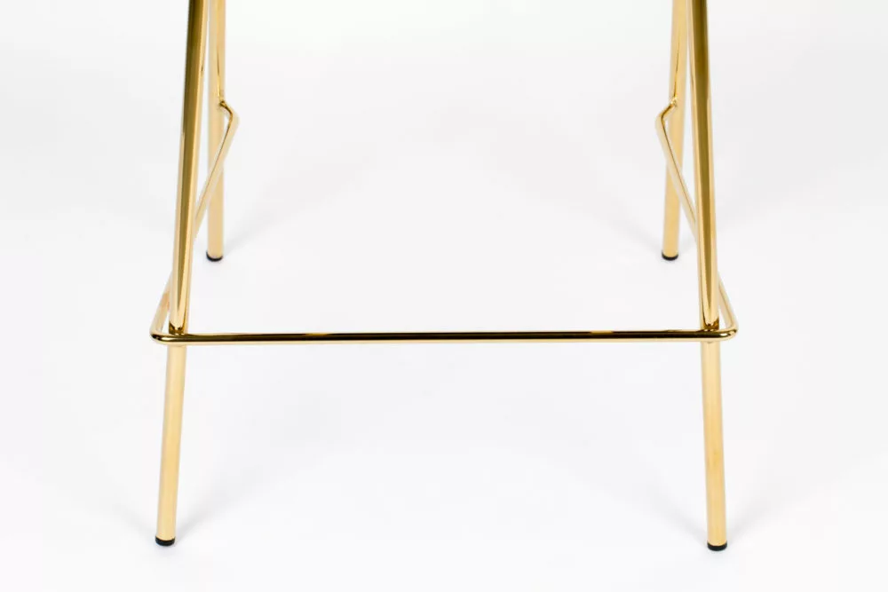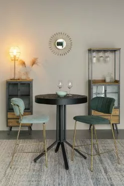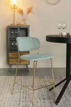 Ihanan pehmeä Jolien baarituoli saarekkeeseen sopivassa koossa. Vaaleanvihreä samettinen baarituoli supermukavalla pehmustetulla istuinosalla ja kunnon selkänojalla on todella miellyttävä istua. Kultaiset jalat viimeistelevät ylellisen kokemuksen.