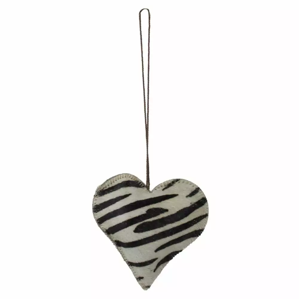 Roikkuva joulukoriste sydän seeprakuviolla, lehmäntaljasta. Maanläheistä rouheaa tunnelmaa tyylikkäästi. Ripusta kuuseen tai minne kaipaat hieman lämpöistä joulun tunnelmaa.