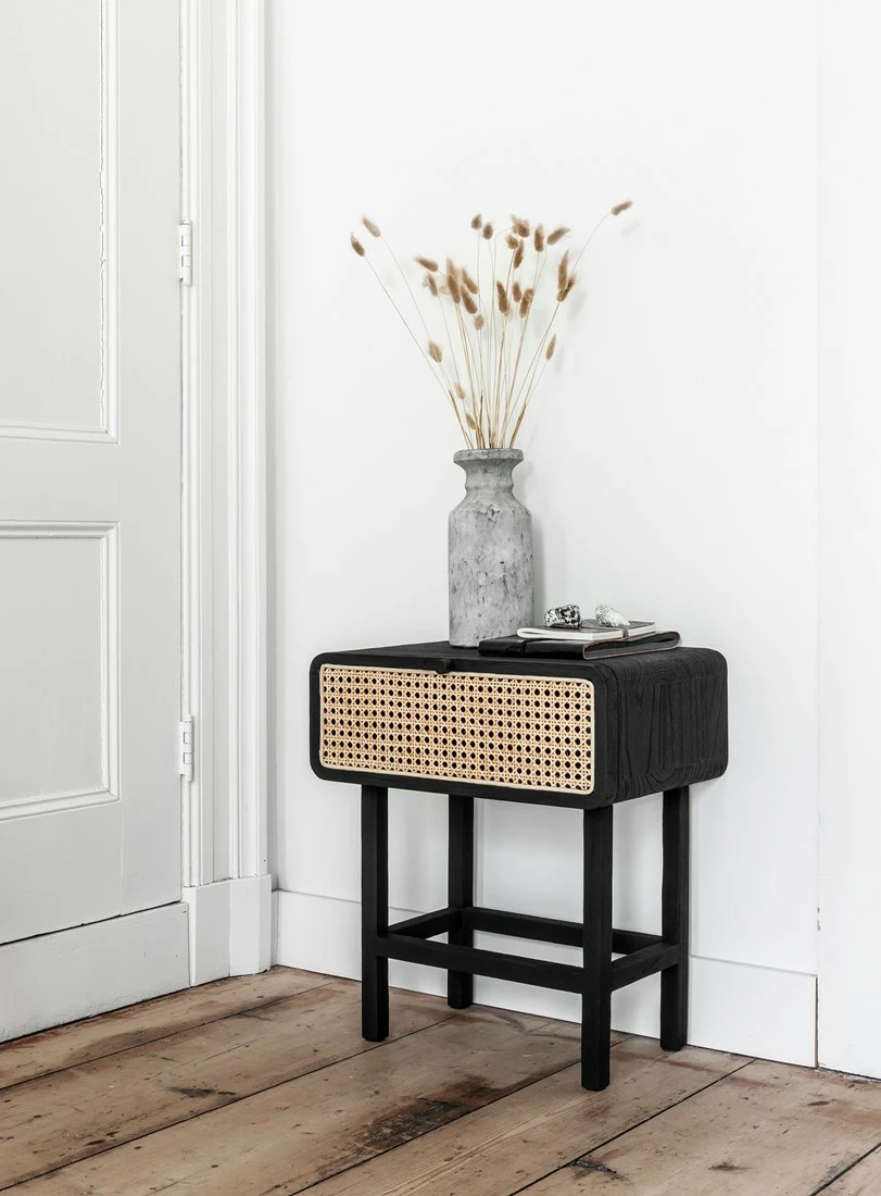 Jotain erilaista tyylillä! Rottinkinen sivupöytä, joka pysyy paikoillaan, ja jota kestää katsella pidempäänkin. Täydellinen säilytyskaluste eteiseen tai yöpöytä. Jos boho sisustus on lähellä sydäntä, mutta et halua tinkiä tyylistä, tässä siis laatua taloon.