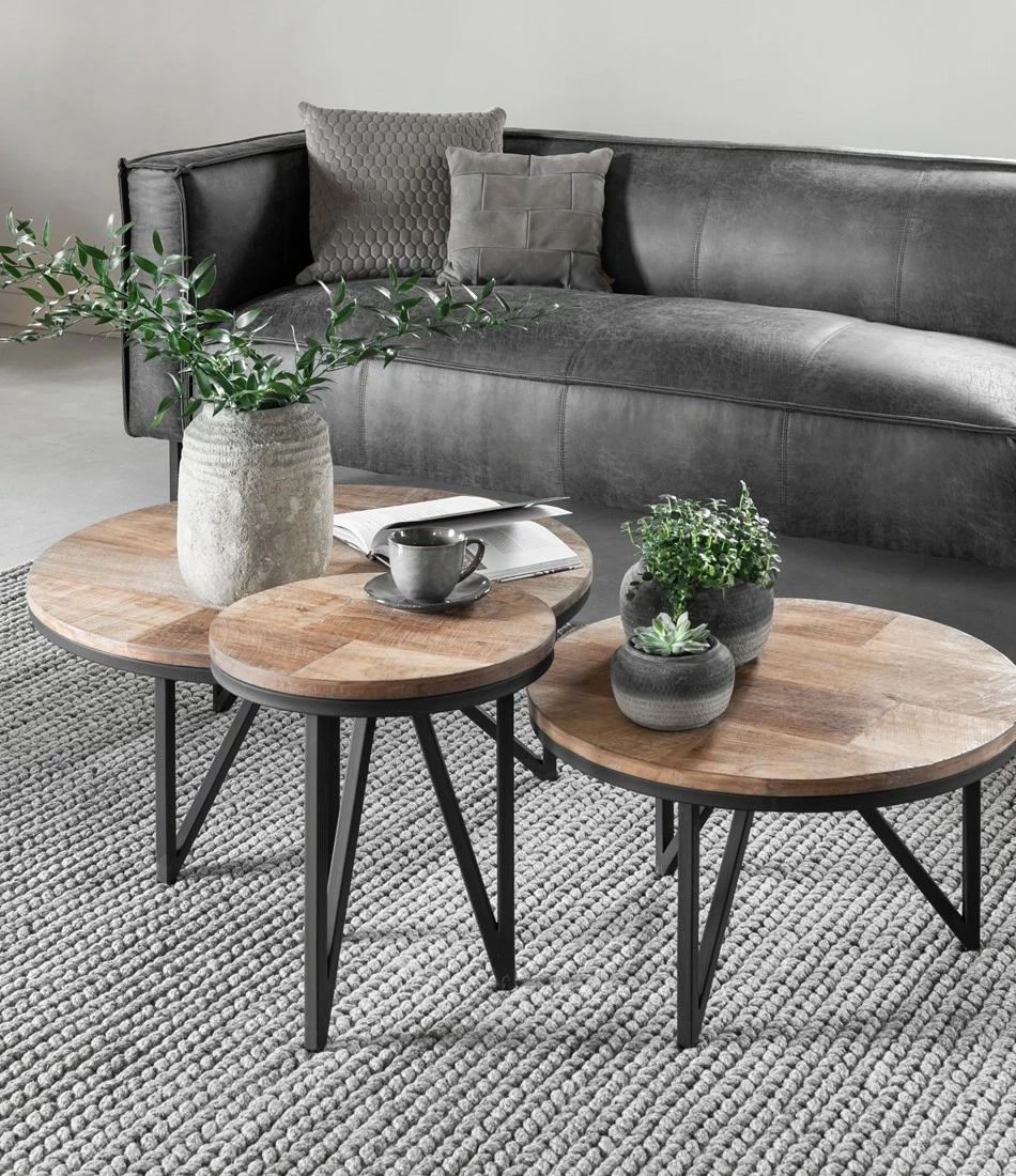 Tyylikäs pyöreä ja puinen sohvapöytä vahvoilla mustilla metallijaloilla. Tyylikkään viimeistelemättömäksi jätetty rouhea tiikkipinta tuo kotoisuutta ja lämpöä sisustukseen modernilla tavalla. Rautakehys nousee kauniisti tiikkipuisen pöytälevyn alle ja luo pöydälle kehyksen. Jalat muodostavat näyttävän kolmiokuvion. Tälle tiikkipöydälle voit huoletta laskea kahvikupin tai viinilasin. Se ei pienestä hetkahda ja on myös helppohoitoinen.