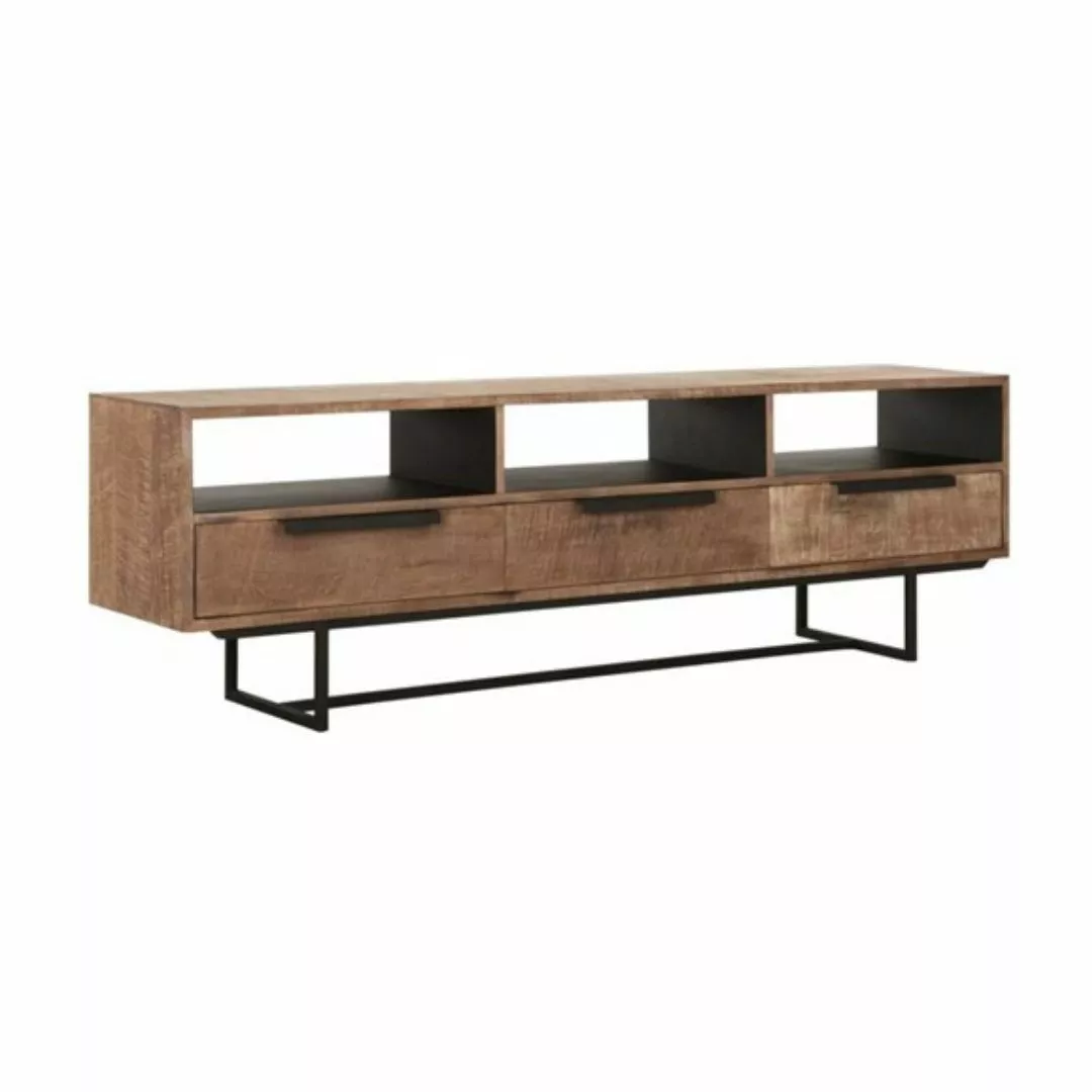 Tyylikäs tiikkipuinen TV-taso vahvoilla mustilla metallijaloilla. Kolme vetolaatikkoa niille kamppeille, jotka saisivat pysyä piilossa ja reilusti avotilaa vekottimille, joiden taas pitää pysyä esillä. Rouheasti viimeistelty tiikkipinta tuo kotoisuutta ja lämpöä sisustukseen. Rautajalat nostavat tv-tason käytännölliseesti vähän ilmaan, mikä tekee huonekalusta ilmavan. Kaunis ja helppohoitoinen tiikkipuu on kestävä ja ikuinen materiaali.