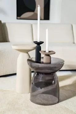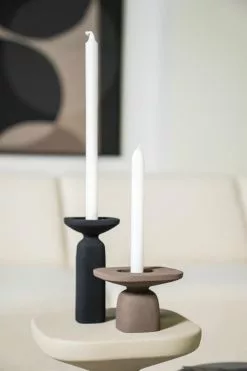 Pehmeitä linjoja yllätyksellisillä materiaaliyhdistelmillä. Tämä kaunis pyöreälinjainen musta kynttilänjalka vaikuttaa kiveltä, mutta on tehty metallista ja hiekkakäsitelty päältä. Käsitettelyllä on saatu aikaan upea mielenkiintoinen musta mattapinta tähän pöytäkynttilälle tai isolle tuikulle sopivaan kynttilänjalkaan. Yhdistä saman sarjan muihin kokoihin.