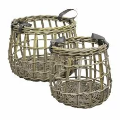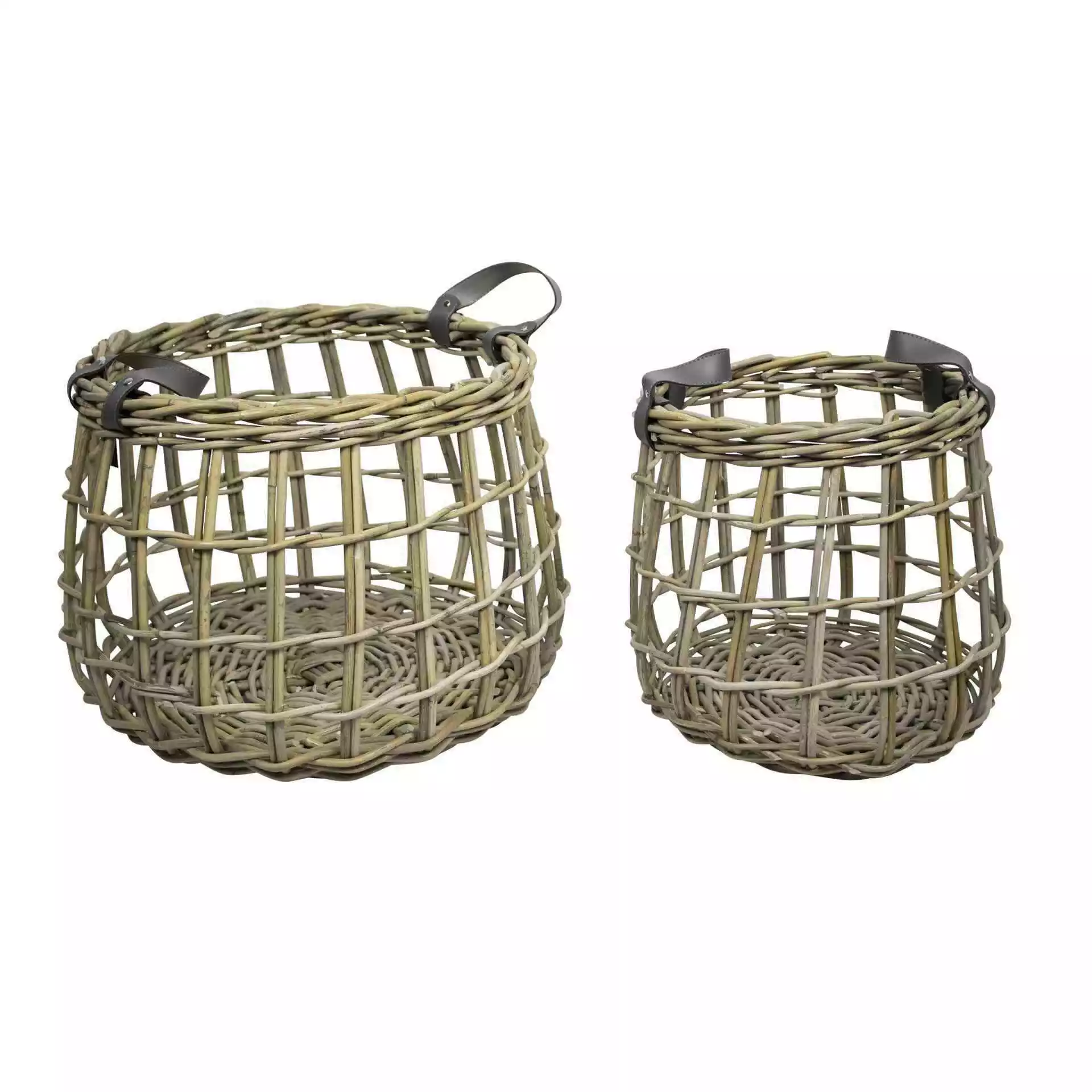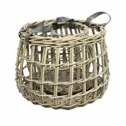 Suuri rottinkikori tyylikkäillä nahkahihnoilla säilytykseen, somisteeksi tai suojaruukuksi. Saatavilla myös pienempi koko, joka mahtuu suuremman sisään.
