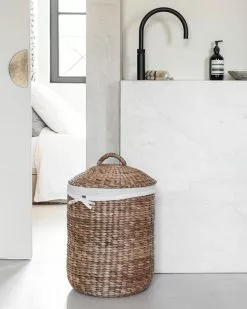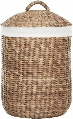 Kaunis Tahiti pyykkikori kangasvuorella on sekä käytännöllinen, ilmava että kaunis pyykkikori. Kestävä vesihyasintti on korimateriaalina verraton, sillä sitä kerätään haitallisena vieraslajina ja sen punomisominaisuudet sekä kestävyys ovat omaa luokkaansa. Vahva kori raikkaan valkoisella puuvillakangasvuorella.