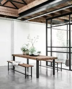 Katsetta ja elämää kestävään sisustustyyliin jykevä puinen ruokapöytä koossa 275×100 cm. Perinteinen muoto, jossa jalat lähtevät pöydän päistä, ja jättävät päädyn auki – mutta siihen se perinteisyys loppuukin. Tämän tiikkipöydän näyttävyys tulee 8cm (!) paksusta pöytälevystä sekä sen upeasti sahausjälkiä koristavista päistä. Rautajalat nousevat upeana yksityiskohtana pöytälevyn päälle asti, tuoden ilmeikkyyttä myös pöytälevyn pintaan. Tämä pöytää kestää arjen – ja varsinkin juhlat!