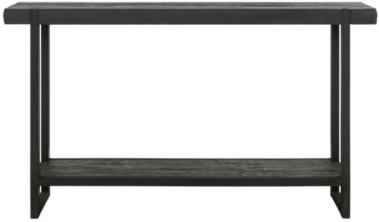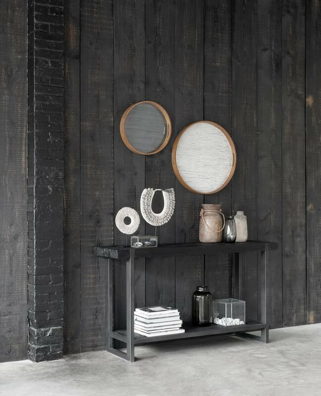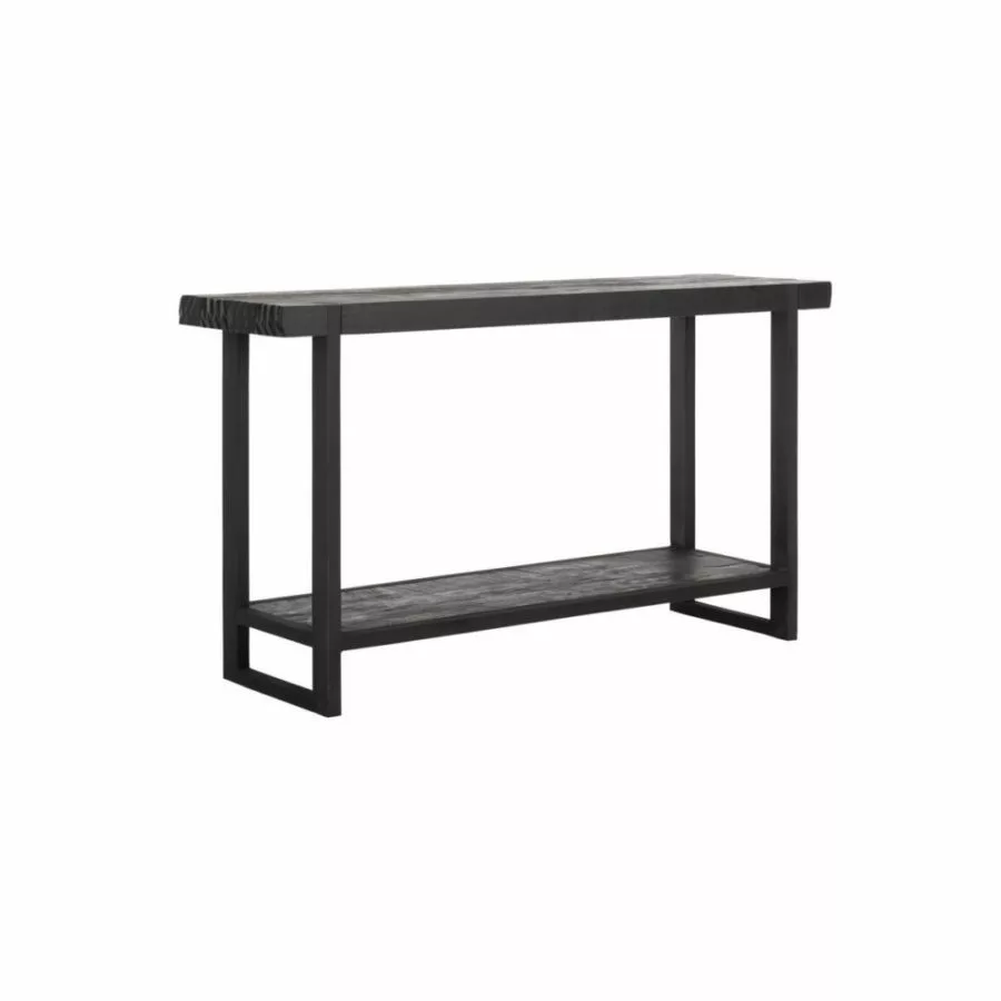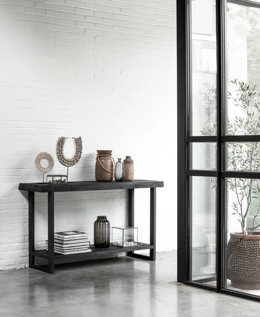Katsetta ja elämää kestävään sisustustyyliin jykevä puinen konsolipöytä mustana. Upea 6cm paksu taso kierrätystiikistä ja rautarunko kestää näyttävimmätkin sisustusartikkelit eikä tarvitse huolehtia liikahtaisiko pöytä eläinten, lasten tai omista temmellyksistä! Puinen alahylly tuo lisäsäilytystilaa. Toimii mainiosti eteisen laskutilana ja kauniina sisustuselementtinä, sekä myös olohuoneen sisustukseen. Saatavilla myös naturel -versiona.