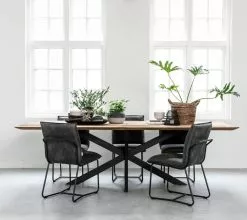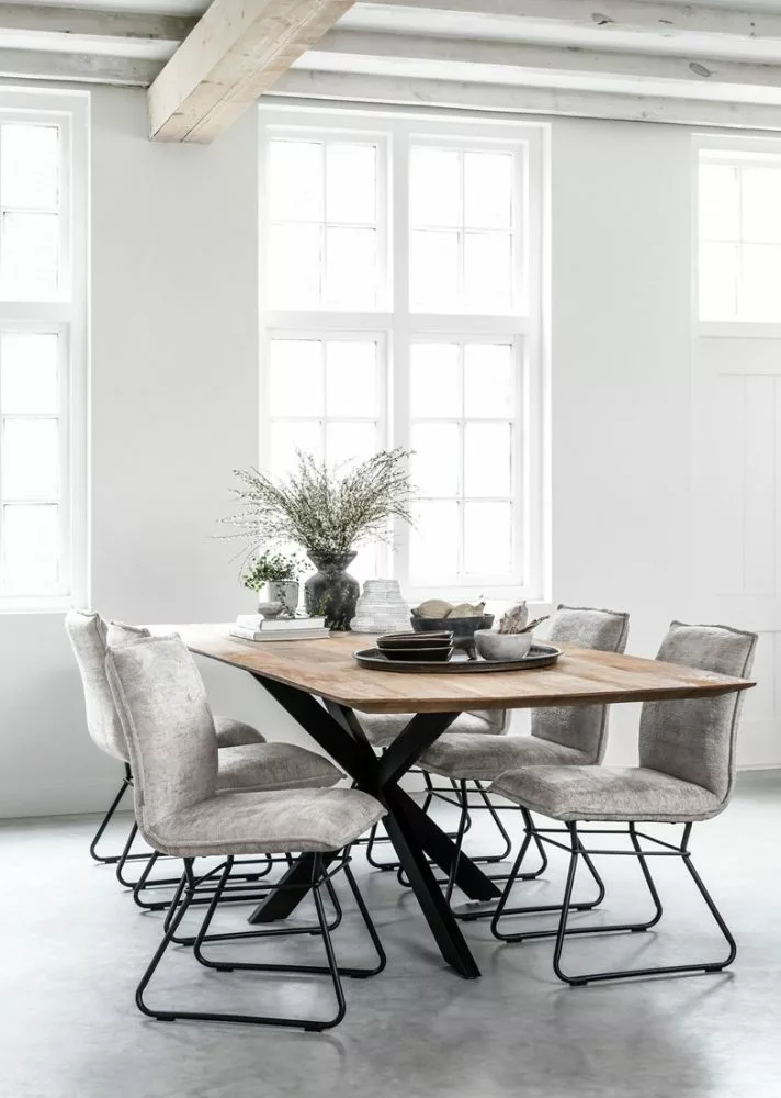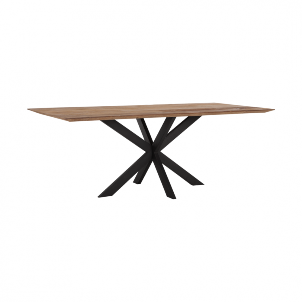 Tyylikäs tiikkipuinen ruokapöytä vahvoilla mustilla hämähäkkijaloilla. Kätevä koko 6 hengelle ja kahdeksankin vielä sopii. Tyylikkään viimeistelemättömäksi jätetty rouhea tiikkipinta tuo kotoisuutta ja lämpöä sisustukseen. Pöydän alareuna on viimeistelty vinoksi, mikä tekee suureen pöytään kuitenkin elegantin loppusilauksen. Rautajalat muodostavat näyttävän ristikkokuvion. Tiikipöytä ei pienestä tällistä hetkahda ja on myös helppohoitoinen.