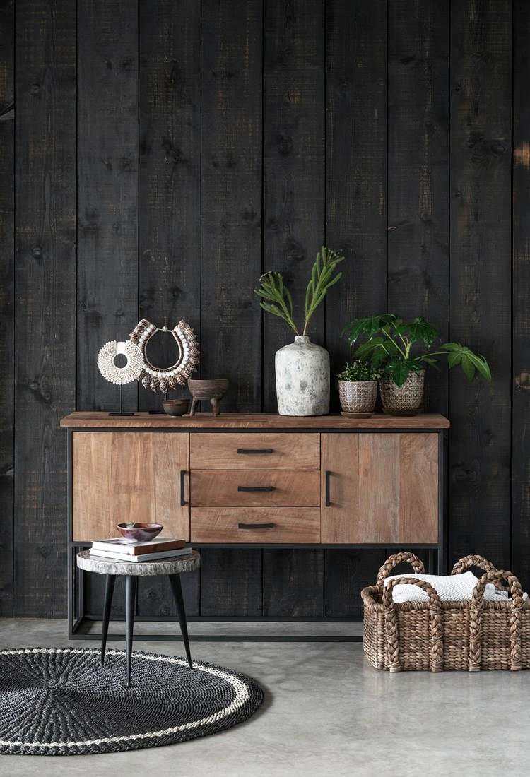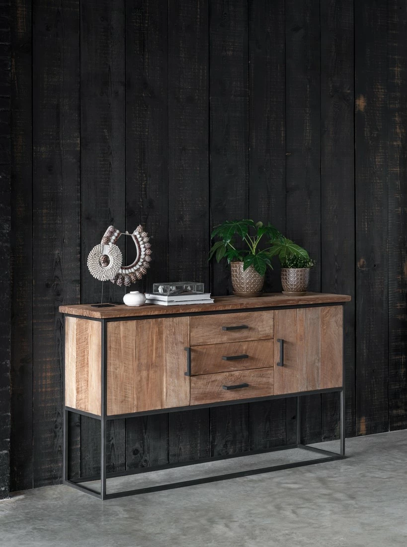 Tyylikäs puinen senkki mattamustalla metallirungolla. Rouhea, mutta taidokkaasti viimeistelty tiikkipinta tuo kotoisuutta ja lämpöä sisustukseen. Kaksi ovellista kaappia sekä kolme laatikkoa. Tukeva senkki seisoo jaloillaan, mikä tuo ilmavuutta isoon astiakaappiin. Monikäyttöinen, helppohoitoinen ja näyttävä tiikkipuinen senkki.